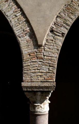 La chiesa fu costruita su modello romano a pianta basilicale, divisa in tre navate da due file di colonne e pilastri. Al di sopra corre un ordine di monofore con cornice di tufo policromo. Tracce di arcate in tufo e laterizio e di un grande arco testimoniano il tentativo, non realizzato, di ampliare l'edificio trasformandolo a croce latina orientata verso est.
