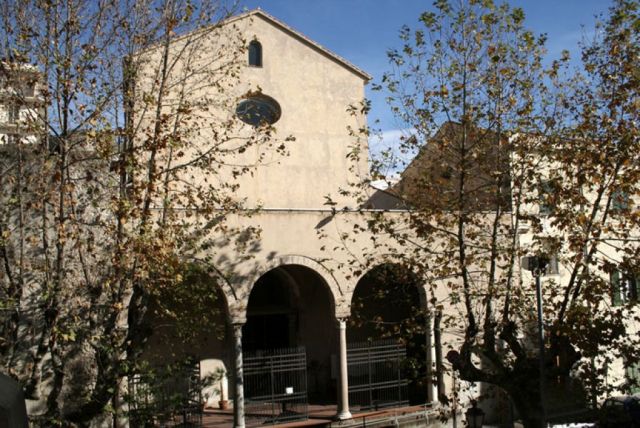 L'ingresso della chiesa era originariamente preceduto da un quadriportico, distrutto quando fu creata la via San Benedetto. Di esso si scorge ancora parte del lato meridionale all'interno del Museo Provinciale e parte di quello orientale dinnanzi all'ingresso.